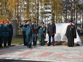 Открыли монумент начальник Специального управления №2 МЧС России полковник внутренней службы Владимир Дерышев и ветеран противопожарной службы - бывший начальник управления Антипин Иван Максимович.