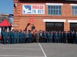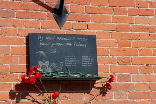 Мемориальная плита с именами пожарных, ушедших на фронт в годы Великой Отечественной войны 1941-1945 гг. Расположена на здании пожарного депо 54 ПСЧ ФПС ГПС ФГКУ «8 отряд ФПС по Алтайскому краю» в г. Камень-на-Оби, ул. Комсомольская, 12.