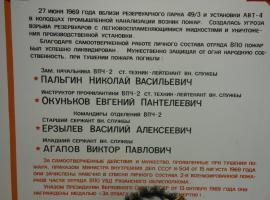 27 июня 1969 года в 17 часов 15 минут вследствие возникновения пожара, возникла угроза взрыва резервуаров с легковоспламеняющимися жидкостями на территории Рязанского нефтеперерабатывающего предприятия. Благодаря самоотверженной работе личного состава отряда ВПО-1 пожар был успешно ликвидирован, без возможных, серьезных последствиях.