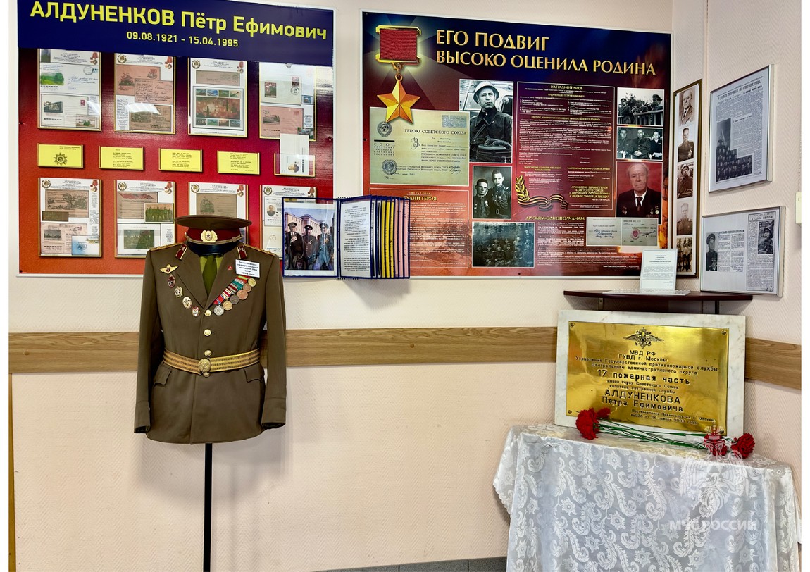 В подразделении создали исторический уголок, посвященный памяти Петра Ефимовича Алдуненкова. Там представлена форма солдата Великой Отечественной войны, восстановленная усилиями сотрудников. Но главное - это воссозданный в виде экспозиции воинский путь Алдуненкова, доступный для гостей части, приходящих на экскурсии.