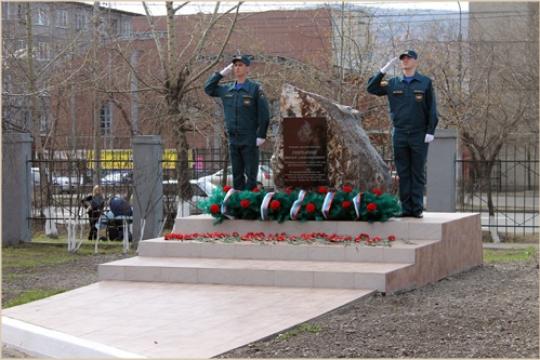 Мемориальный камень, посвященный 30-летию со дня гибели на пожаре 7 апреля 1983 года при исполнении служебных обязанностей Гончарова Виктора Александровича.