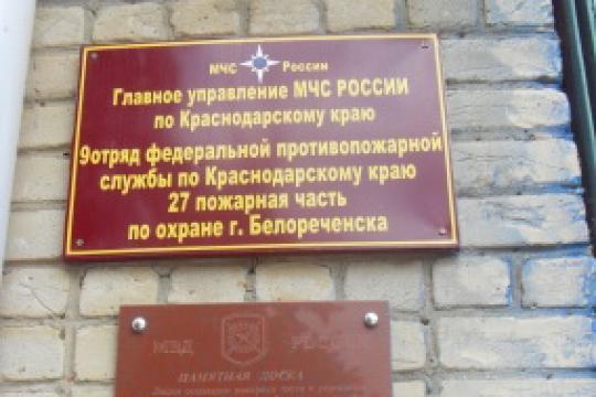Мемориальная доска посвященная сотрудникам, создавшим пожарные части и укрепившим боеготовность пожарной охраны Белореченского района.