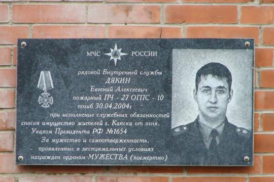 Указом Президента Российской Федерации от 31.12.2004 г. рядовой внутренней службы Е. А. Дякин награжден орденом Мужества (посмертно). Е. А. Дякин (1981-2004), рядовой внутренней службы. Служба 2003-2004 гг. (пожарный).
