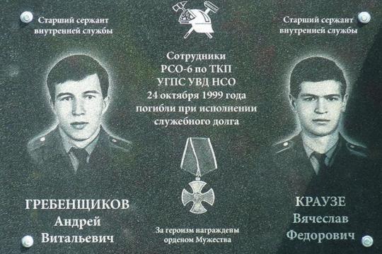17 октября 2011 года на у здания ФГКУ «СПЧ ФПС по Новосибирской области», находящегося по адресу г. Новосибирск, ул. Дунаевского, 28, состоялось торжественное открытие мемориальной доски в честь старшего сержанта внутренней службы Гребенщикова Андрея Витальевича – мастера-пожарного 6 РСО по ТКП УГПС ГУВД Новосибирской области и старшего сержанта внутренней службы Краузе Вячеслава Федоровича – мастера-пожарного 6 РСО по ТКП УГПС ГУВД Новосибирской области, погибших при исполнении служебных обязанностей.