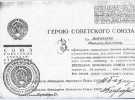 Указом Президиума Верховного Совета СССР от 10 января 1944 года за образцовое выполнение боевых заданий командования на фронте борьбы с немецкими захватчиками и проявленные при этом отвагу и геройство гвардии младшему сержанту Воробьёву Николаю Павловичу присвоено звание Героя Советского Союза с вручением ордена Ленина и медали «Золотая Звезда».